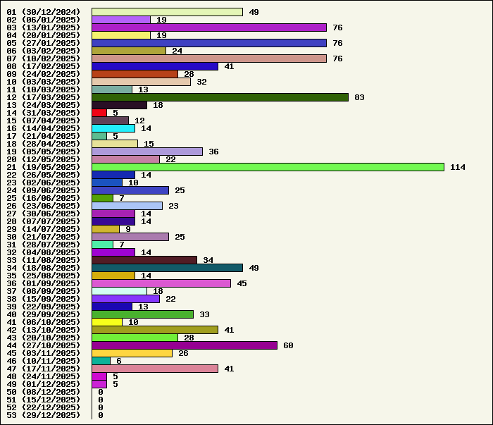 | Logiciel | Semaine 49 | Mois 12 | Année 2025 | Total | | Anti Yeux rouges | 0 | 0 | 54 | 134323 | | AutoMail | 1 | 1 | 80 | 1816 | | Autorun | 0 | 0 | 37 | 2740 | | AxelCodBar (Codes barres) | 2 | 2 | 237 | 17552 | | AxelFTP | 0 | 0 | 43 | 1816 | | AxelTime | 1 | 1 | 80 | 6787 | | AxelWebCam | 0 | 0 | 3 | 8248 | | Boulier | 0 | 0 | 42 | 1589 | | Castet | 0 | 0 | 35 | 1100 | | Chiffres | 0 | 0 | 41 | 1868 | | Compteur Internet | 0 | 0 | 63 | 2319 | | Crédits | 0 | 0 | 38 | 2003 | | Espérance de vie | 0 | 0 | 59 | 3554 | | File Renamor | 0 | 0 | 43 | 1971 | | FindReplaceInFiles | 0 | 0 | 36 | 1137 | | Matricielle | 0 | 0 | 45 | 4564 | | Mosaic Maker | 0 | 0 | 35 | 3049 | | MultiClip | 0 | 0 | 36 | 2111 | | MultiMail | 0 | 0 | 40 | 1078 | | MultiZip | 0 | 0 | 38 | 1564 | | MusicStart | 0 | 0 | 44 | 920 | | RepPrinter | 0 | 0 | 61 | 4107 | | Synchronizor | 0 | 0 | 51 | 3929 | | Winetik | 0 | 0 | 0 | 1008 | | Winfish | 0 | 0 | 0 | 673 | | Wintab | 0 | 0 | 24 | 3787 | | WorPad Axel | 0 | 0 | 39 | 148 | | Yaskifo! analysor | 0 | 0 | 0 | 90 | | Total | 4 | 4 | 1304 | 215851 |