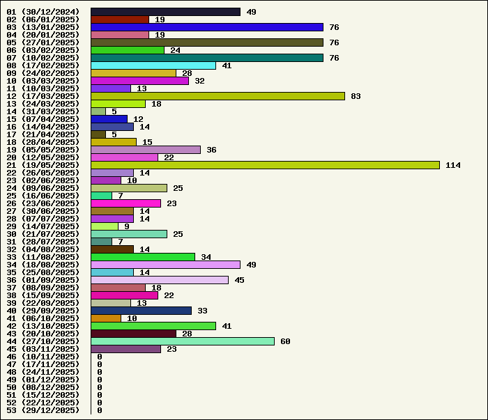 | Logiciel | Semaine 45 | Mois 11 | Année 2025 | Total | | Anti Yeux rouges | 0 | 2 | 52 | 134321 | | AutoMail | 6 | 14 | 76 | 1812 | | Autorun | 0 | 1 | 36 | 2739 | | AxelCodBar (Codes barres) | 2 | 3 | 228 | 17543 | | AxelFTP | 1 | 2 | 41 | 1814 | | AxelTime | 2 | 4 | 70 | 6777 | | AxelWebCam | 0 | 0 | 3 | 8248 | | Boulier | 0 | 0 | 41 | 1588 | | Castet | 0 | 1 | 34 | 1099 | | Chiffres | 0 | 3 | 40 | 1867 | | Compteur Internet | 1 | 3 | 61 | 2317 | | Crédits | 0 | 2 | 36 | 2001 | | Espérance de vie | 1 | 3 | 55 | 3550 | | File Renamor | 0 | 6 | 42 | 1970 | | FindReplaceInFiles | 0 | 0 | 35 | 1136 | | Matricielle | 0 | 2 | 44 | 4563 | | Mosaic Maker | 0 | 2 | 34 | 3048 | | MultiClip | 0 | 0 | 35 | 2110 | | MultiMail | 0 | 3 | 39 | 1077 | | MultiZip | 0 | 1 | 37 | 1563 | | MusicStart | 0 | 8 | 43 | 919 | | RepPrinter | 3 | 3 | 58 | 4104 | | Synchronizor | 0 | 2 | 47 | 3925 | | Winetik | 0 | 0 | 0 | 1008 | | Winfish | 0 | 0 | 0 | 673 | | Wintab | 0 | 0 | 24 | 3787 | | WorPad Axel | 0 | 1 | 38 | 147 | | Yaskifo! analysor | 0 | 0 | 0 | 90 | | Total | 16 | 66 | 1249 | 215796 |