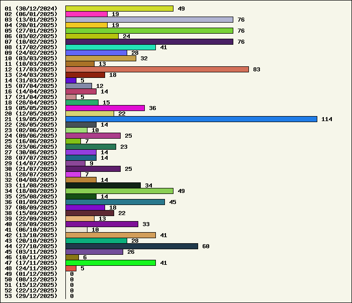 | Logiciel | Semaine 49 | Mois 12 | Année 2025 | Total | | Anti Yeux rouges | 0 | 0 | 54 | 134323 | | AutoMail | 0 | 0 | 79 | 1815 | | Autorun | 0 | 0 | 37 | 2740 | | AxelCodBar (Codes barres) | 0 | 0 | 235 | 17550 | | AxelFTP | 0 | 0 | 43 | 1816 | | AxelTime | 0 | 0 | 79 | 6786 | | AxelWebCam | 0 | 0 | 3 | 8248 | | Boulier | 0 | 0 | 42 | 1589 | | Castet | 0 | 0 | 35 | 1100 | | Chiffres | 0 | 0 | 41 | 1868 | | Compteur Internet | 0 | 0 | 63 | 2319 | | Crédits | 0 | 0 | 38 | 2003 | | Espérance de vie | 0 | 0 | 59 | 3554 | | File Renamor | 0 | 0 | 43 | 1971 | | FindReplaceInFiles | 0 | 0 | 36 | 1137 | | Matricielle | 0 | 0 | 45 | 4564 | | Mosaic Maker | 0 | 0 | 35 | 3049 | | MultiClip | 0 | 0 | 36 | 2111 | | MultiMail | 0 | 0 | 40 | 1078 | | MultiZip | 0 | 0 | 38 | 1564 | | MusicStart | 0 | 0 | 44 | 920 | | RepPrinter | 0 | 0 | 61 | 4107 | | Synchronizor | 0 | 0 | 51 | 3929 | | Winetik | 0 | 0 | 0 | 1008 | | Winfish | 0 | 0 | 0 | 673 | | Wintab | 0 | 0 | 24 | 3787 | | WorPad Axel | 0 | 0 | 39 | 148 | | Yaskifo! analysor | 0 | 0 | 0 | 90 | | Total | 0 | 0 | 1300 | 215847 |