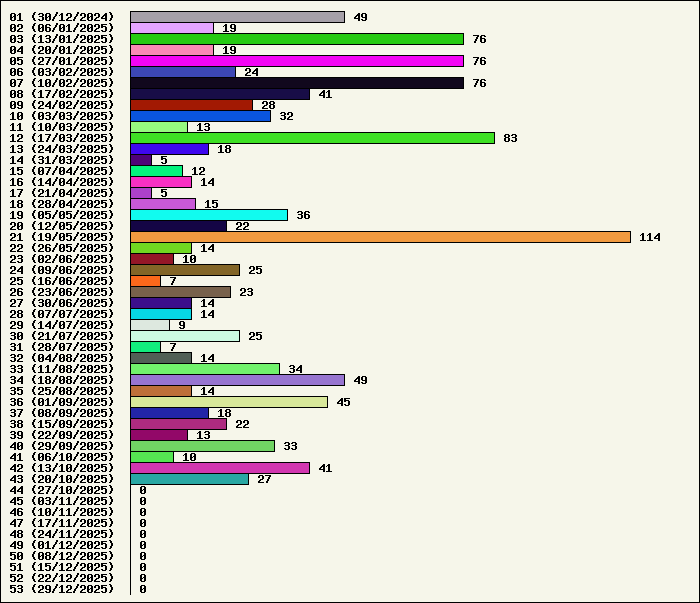 Logiciel | Semaine 43 | Mois 10 | Année 2025 | Total | Anti Yeux rouges | 1 | 4 | 50 | 134319 | AutoMail | 1 | 3 | 60 | 1796 | Autorun | 0 | 3 | 35 | 2738 | AxelCodBar (Codes barres) | 6 | 25 | 222 | 17537 | AxelFTP | 1 | 3 | 39 | 1812 | AxelTime | 1 | 4 | 65 | 6772 | AxelWebCam | 0 | 0 | 3 | 8248 | Boulier | 1 | 3 | 41 | 1588 | Castet | 1 | 2 | 33 | 1098 | Chiffres | 1 | 2 | 37 | 1864 | Compteur Internet | 1 | 3 | 58 | 2314 | Crédits | 1 | 1 | 34 | 1999 | Espérance de vie | 1 | 2 | 52 | 3547 | File Renamor | 1 | 2 | 36 | 1964 | FindReplaceInFiles | 1 | 3 | 35 | 1136 | Matricielle | 1 | 5 | 42 | 4561 | Mosaic Maker | 0 | 1 | 32 | 3046 | MultiClip | 1 | 3 | 35 | 2110 | MultiMail | 1 | 2 | 36 | 1074 | MultiZip | 1 | 2 | 36 | 1562 | MusicStart | 1 | 4 | 35 | 911 | RepPrinter | 1 | 2 | 55 | 4101 | Synchronizor | 1 | 3 | 45 | 3923 | Winetik | 0 | 0 | 0 | 1008 | Winfish | 0 | 0 | 0 | 673 | Wintab | 0 | 2 | 23 | 3786 | WorPad Axel | 1 | 2 | 37 | 146 | Yaskifo! analysor | 0 | 0 | 0 | 90 | Total | 26 | 86 | 1176 | 215723 |