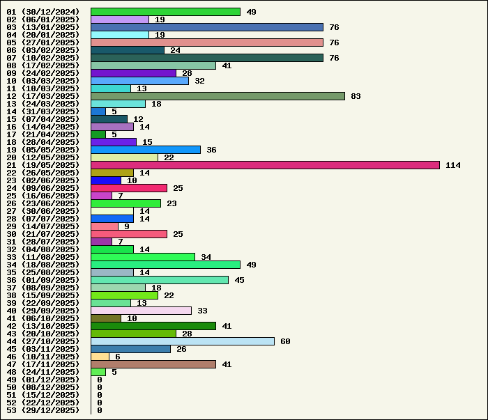 | Logiciel | Semaine 48 | Mois 11 | Année 2025 | Total | | Anti Yeux rouges | 0 | 4 | 54 | 134323 | | AutoMail | 0 | 17 | 79 | 1815 | | Autorun | 0 | 2 | 37 | 2740 | | AxelCodBar (Codes barres) | 1 | 10 | 235 | 17550 | | AxelFTP | 0 | 4 | 43 | 1816 | | AxelTime | 0 | 13 | 79 | 6786 | | AxelWebCam | 0 | 0 | 3 | 8248 | | Boulier | 0 | 1 | 42 | 1589 | | Castet | 0 | 2 | 35 | 1100 | | Chiffres | 0 | 4 | 41 | 1868 | | Compteur Internet | 0 | 5 | 63 | 2319 | | Crédits | 0 | 4 | 38 | 2003 | | Espérance de vie | 2 | 7 | 59 | 3554 | | File Renamor | 0 | 7 | 43 | 1971 | | FindReplaceInFiles | 0 | 1 | 36 | 1137 | | Matricielle | 0 | 3 | 45 | 4564 | | Mosaic Maker | 0 | 3 | 35 | 3049 | | MultiClip | 0 | 1 | 36 | 2111 | | MultiMail | 0 | 4 | 40 | 1078 | | MultiZip | 0 | 2 | 38 | 1564 | | MusicStart | 0 | 9 | 44 | 920 | | RepPrinter | 1 | 6 | 61 | 4107 | | Synchronizor | 0 | 6 | 51 | 3929 | | Winetik | 0 | 0 | 0 | 1008 | | Winfish | 0 | 0 | 0 | 673 | | Wintab | 0 | 0 | 24 | 3787 | | WorPad Axel | 0 | 2 | 39 | 148 | | Yaskifo! analysor | 0 | 0 | 0 | 90 | | Total | 4 | 117 | 1300 | 215847 |