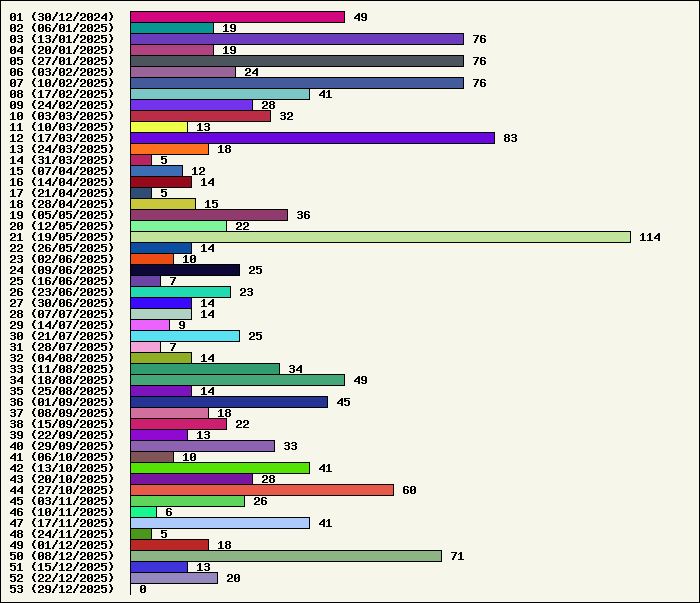 | Logiciel | Semaine 52 | Mois 12 | Année 2025 | Total | | Anti Yeux rouges | 1 | 2 | 56 | 134325 | | AutoMail | 1 | 12 | 91 | 1827 | | Autorun | 0 | 2 | 39 | 2742 | | AxelCodBar (Codes barres) | 3 | 21 | 256 | 17571 | | AxelFTP | 1 | 2 | 45 | 1818 | | AxelTime | 6 | 21 | 100 | 6807 | | AxelWebCam | 0 | 0 | 3 | 8248 | | Boulier | 0 | 2 | 44 | 1591 | | Castet | 0 | 1 | 36 | 1101 | | Chiffres | 1 | 5 | 46 | 1873 | | Compteur Internet | 0 | 2 | 65 | 2321 | | Crédits | 0 | 0 | 38 | 2003 | | Espérance de vie | 0 | 1 | 60 | 3555 | | File Renamor | 1 | 5 | 48 | 1976 | | FindReplaceInFiles | 0 | 5 | 41 | 1142 | | Matricielle | 0 | 3 | 48 | 4567 | | Mosaic Maker | 1 | 1 | 36 | 3050 | | MultiClip | 0 | 2 | 38 | 2113 | | MultiMail | 0 | 2 | 42 | 1080 | | MultiZip | 1 | 3 | 41 | 1567 | | MusicStart | 0 | 0 | 44 | 920 | | RepPrinter | 0 | 2 | 63 | 4109 | | Synchronizor | 0 | 9 | 60 | 3938 | | Winetik | 0 | 0 | 0 | 1008 | | Winfish | 0 | 0 | 0 | 673 | | Wintab | 0 | 3 | 27 | 3790 | | WorPad Axel | 0 | 3 | 42 | 151 | | Yaskifo! analysor | 0 | 0 | 0 | 90 | | Total | 16 | 109 | 1409 | 215956 |