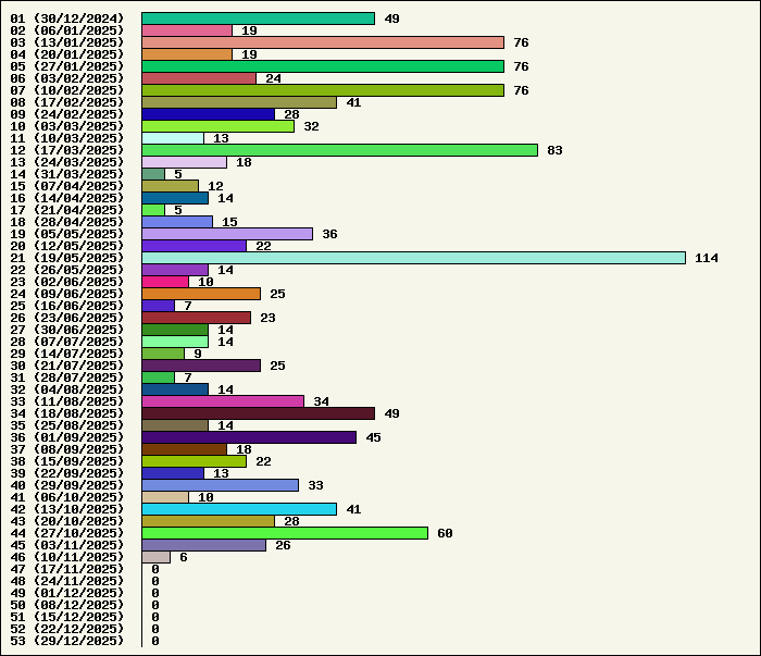 | Logiciel | Semaine 46 | Mois 11 | Année 2025 | Total | | Anti Yeux rouges | 1 | 3 | 53 | 134322 | | AutoMail | 0 | 15 | 77 | 1813 | | Autorun | 0 | 1 | 36 | 2739 | | AxelCodBar (Codes barres) | 2 | 6 | 231 | 17546 | | AxelFTP | 0 | 2 | 41 | 1814 | | AxelTime | 1 | 5 | 71 | 6778 | | AxelWebCam | 0 | 0 | 3 | 8248 | | Boulier | 0 | 0 | 41 | 1588 | | Castet | 0 | 1 | 34 | 1099 | | Chiffres | 0 | 3 | 40 | 1867 | | Compteur Internet | 1 | 4 | 62 | 2318 | | Crédits | 0 | 2 | 36 | 2001 | | Espérance de vie | 0 | 3 | 55 | 3550 | | File Renamor | 0 | 6 | 42 | 1970 | | FindReplaceInFiles | 0 | 0 | 35 | 1136 | | Matricielle | 0 | 2 | 44 | 4563 | | Mosaic Maker | 0 | 2 | 34 | 3048 | | MultiClip | 0 | 0 | 35 | 2110 | | MultiMail | 0 | 3 | 39 | 1077 | | MultiZip | 0 | 1 | 37 | 1563 | | MusicStart | 0 | 8 | 43 | 919 | | RepPrinter | 0 | 3 | 58 | 4104 | | Synchronizor | 0 | 2 | 47 | 3925 | | Winetik | 0 | 0 | 0 | 1008 | | Winfish | 0 | 0 | 0 | 673 | | Wintab | 0 | 0 | 24 | 3787 | | WorPad Axel | 0 | 1 | 38 | 147 | | Yaskifo! analysor | 0 | 0 | 0 | 90 | | Total | 5 | 73 | 1256 | 215803 |