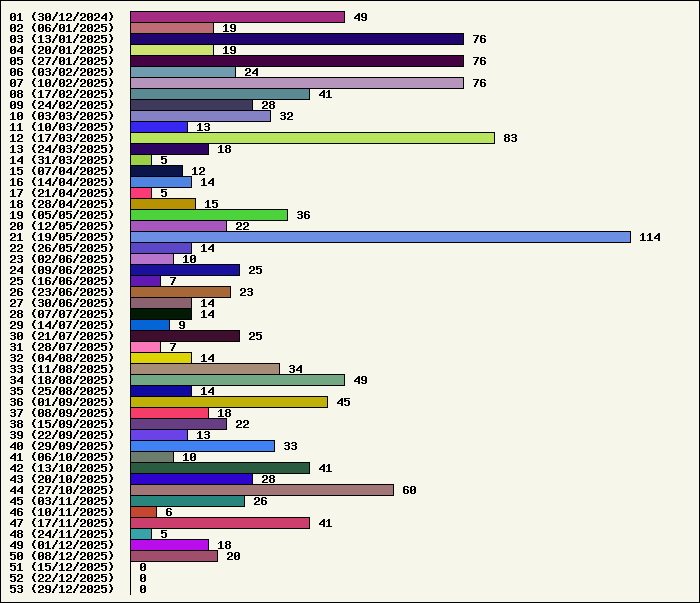 | Logiciel | Semaine 50 | Mois 12 | Année 2025 | Total | | Anti Yeux rouges | 0 | 0 | 54 | 134323 | | AutoMail | 2 | 5 | 84 | 1820 | | Autorun | 0 | 0 | 37 | 2740 | | AxelCodBar (Codes barres) | 6 | 12 | 247 | 17562 | | AxelFTP | 0 | 0 | 43 | 1816 | | AxelTime | 2 | 5 | 84 | 6791 | | AxelWebCam | 0 | 0 | 3 | 8248 | | Boulier | 0 | 0 | 42 | 1589 | | Castet | 0 | 0 | 35 | 1100 | | Chiffres | 0 | 0 | 41 | 1868 | | Compteur Internet | 0 | 1 | 64 | 2320 | | Crédits | 0 | 0 | 38 | 2003 | | Espérance de vie | 0 | 1 | 60 | 3555 | | File Renamor | 0 | 0 | 43 | 1971 | | FindReplaceInFiles | 0 | 0 | 36 | 1137 | | Matricielle | 0 | 0 | 45 | 4564 | | Mosaic Maker | 0 | 0 | 35 | 3049 | | MultiClip | 0 | 0 | 36 | 2111 | | MultiMail | 0 | 1 | 41 | 1079 | | MultiZip | 0 | 0 | 38 | 1564 | | MusicStart | 0 | 0 | 44 | 920 | | RepPrinter | 0 | 0 | 61 | 4107 | | Synchronizor | 7 | 8 | 59 | 3937 | | Winetik | 0 | 0 | 0 | 1008 | | Winfish | 0 | 0 | 0 | 673 | | Wintab | 1 | 1 | 25 | 3788 | | WorPad Axel | 0 | 0 | 39 | 148 | | Yaskifo! analysor | 0 | 0 | 0 | 90 | | Total | 18 | 34 | 1334 | 215881 |