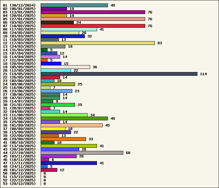| Logiciel | Semaine 49 | Mois 12 | Année 2025 | Total | | Anti Yeux rouges | 0 | 0 | 54 | 134323 | | AutoMail | 1 | 1 | 80 | 1816 | | Autorun | 0 | 0 | 37 | 2740 | | AxelCodBar (Codes barres) | 5 | 5 | 240 | 17555 | | AxelFTP | 0 | 0 | 43 | 1816 | | AxelTime | 1 | 1 | 80 | 6787 | | AxelWebCam | 0 | 0 | 3 | 8248 | | Boulier | 0 | 0 | 42 | 1589 | | Castet | 0 | 0 | 35 | 1100 | | Chiffres | 0 | 0 | 41 | 1868 | | Compteur Internet | 1 | 1 | 64 | 2320 | | Crédits | 0 | 0 | 38 | 2003 | | Espérance de vie | 1 | 1 | 60 | 3555 | | File Renamor | 0 | 0 | 43 | 1971 | | FindReplaceInFiles | 0 | 0 | 36 | 1137 | | Matricielle | 0 | 0 | 45 | 4564 | | Mosaic Maker | 0 | 0 | 35 | 3049 | | MultiClip | 0 | 0 | 36 | 2111 | | MultiMail | 1 | 1 | 41 | 1079 | | MultiZip | 0 | 0 | 38 | 1564 | | MusicStart | 0 | 0 | 44 | 920 | | RepPrinter | 0 | 0 | 61 | 4107 | | Synchronizor | 1 | 1 | 52 | 3930 | | Winetik | 0 | 0 | 0 | 1008 | | Winfish | 0 | 0 | 0 | 673 | | Wintab | 0 | 0 | 24 | 3787 | | WorPad Axel | 0 | 0 | 39 | 148 | | Yaskifo! analysor | 0 | 0 | 0 | 90 | | Total | 11 | 11 | 1311 | 215858 |