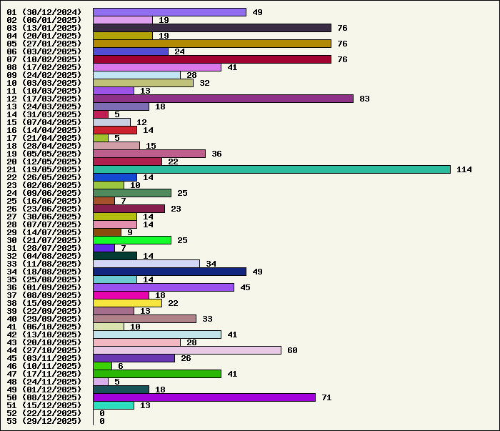 | Logiciel | Semaine 51 | Mois 12 | Année 2025 | Total | | Anti Yeux rouges | 0 | 1 | 55 | 134324 | | AutoMail | 2 | 11 | 90 | 1826 | | Autorun | 0 | 2 | 39 | 2742 | | AxelCodBar (Codes barres) | 1 | 18 | 253 | 17568 | | AxelFTP | 0 | 1 | 44 | 1817 | | AxelTime | 7 | 15 | 94 | 6801 | | AxelWebCam | 0 | 0 | 3 | 8248 | | Boulier | 0 | 2 | 44 | 1591 | | Castet | 0 | 1 | 36 | 1101 | | Chiffres | 0 | 4 | 45 | 1872 | | Compteur Internet | 0 | 2 | 65 | 2321 | | Crédits | 0 | 0 | 38 | 2003 | | Espérance de vie | 0 | 1 | 60 | 3555 | | File Renamor | 0 | 4 | 47 | 1975 | | FindReplaceInFiles | 0 | 5 | 41 | 1142 | | Matricielle | 0 | 3 | 48 | 4567 | | Mosaic Maker | 0 | 0 | 35 | 3049 | | MultiClip | 0 | 2 | 38 | 2113 | | MultiMail | 0 | 2 | 42 | 1080 | | MultiZip | 0 | 2 | 40 | 1566 | | MusicStart | 0 | 0 | 44 | 920 | | RepPrinter | 0 | 2 | 63 | 4109 | | Synchronizor | 0 | 9 | 60 | 3938 | | Winetik | 0 | 0 | 0 | 1008 | | Winfish | 0 | 0 | 0 | 673 | | Wintab | 0 | 3 | 27 | 3790 | | WorPad Axel | 0 | 3 | 42 | 151 | | Yaskifo! analysor | 0 | 0 | 0 | 90 | | Total | 10 | 93 | 1393 | 215940 |
