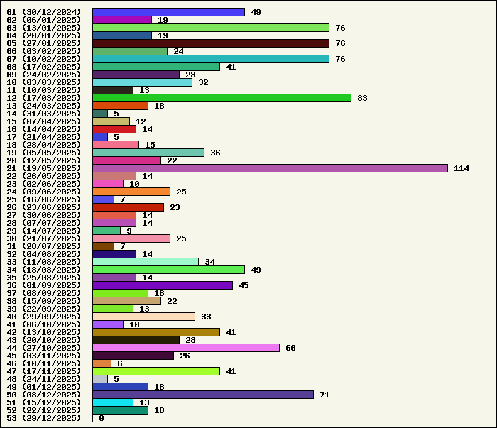 | Logiciel | Semaine 52 | Mois 12 | Année 2025 | Total | | Anti Yeux rouges | 1 | 2 | 56 | 134325 | | AutoMail | 1 | 12 | 91 | 1827 | | Autorun | 0 | 2 | 39 | 2742 | | AxelCodBar (Codes barres) | 3 | 21 | 256 | 17571 | | AxelFTP | 1 | 2 | 45 | 1818 | | AxelTime | 5 | 20 | 99 | 6806 | | AxelWebCam | 0 | 0 | 3 | 8248 | | Boulier | 0 | 2 | 44 | 1591 | | Castet | 0 | 1 | 36 | 1101 | | Chiffres | 1 | 5 | 46 | 1873 | | Compteur Internet | 0 | 2 | 65 | 2321 | | Crédits | 0 | 0 | 38 | 2003 | | Espérance de vie | 0 | 1 | 60 | 3555 | | File Renamor | 1 | 5 | 48 | 1976 | | FindReplaceInFiles | 0 | 5 | 41 | 1142 | | Matricielle | 0 | 3 | 48 | 4567 | | Mosaic Maker | 0 | 0 | 35 | 3049 | | MultiClip | 0 | 2 | 38 | 2113 | | MultiMail | 0 | 2 | 42 | 1080 | | MultiZip | 1 | 3 | 41 | 1567 | | MusicStart | 0 | 0 | 44 | 920 | | RepPrinter | 0 | 2 | 63 | 4109 | | Synchronizor | 0 | 9 | 60 | 3938 | | Winetik | 0 | 0 | 0 | 1008 | | Winfish | 0 | 0 | 0 | 673 | | Wintab | 0 | 3 | 27 | 3790 | | WorPad Axel | 0 | 3 | 42 | 151 | | Yaskifo! analysor | 0 | 0 | 0 | 90 | | Total | 14 | 107 | 1407 | 215954 |