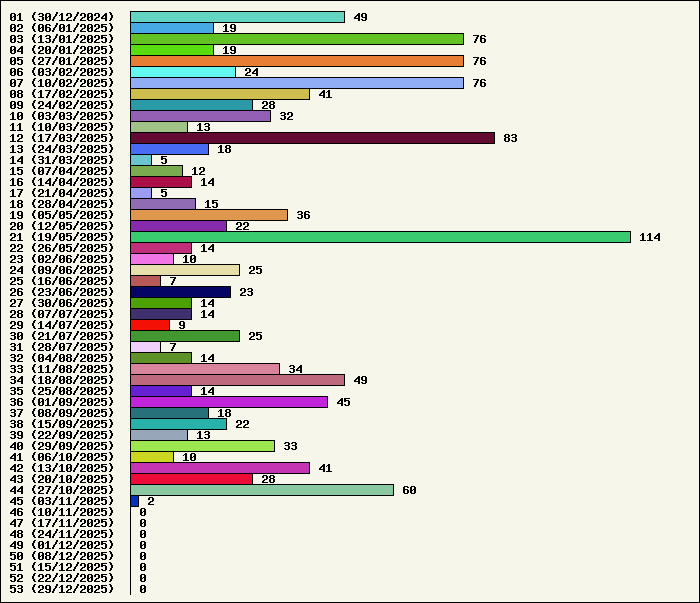 | Logiciel | Semaine 45 | Mois 11 | Année 2025 | Total | | Anti Yeux rouges | 0 | 2 | 52 | 134321 | | AutoMail | 0 | 8 | 70 | 1806 | | Autorun | 0 | 1 | 36 | 2739 | | AxelCodBar (Codes barres) | 1 | 2 | 227 | 17542 | | AxelFTP | 0 | 1 | 40 | 1813 | | AxelTime | 0 | 2 | 68 | 6775 | | AxelWebCam | 0 | 0 | 3 | 8248 | | Boulier | 0 | 0 | 41 | 1588 | | Castet | 0 | 1 | 34 | 1099 | | Chiffres | 0 | 3 | 40 | 1867 | | Compteur Internet | 0 | 2 | 60 | 2316 | | Crédits | 0 | 2 | 36 | 2001 | | Espérance de vie | 0 | 2 | 54 | 3549 | | File Renamor | 0 | 6 | 42 | 1970 | | FindReplaceInFiles | 0 | 0 | 35 | 1136 | | Matricielle | 0 | 2 | 44 | 4563 | | Mosaic Maker | 0 | 2 | 34 | 3048 | | MultiClip | 0 | 0 | 35 | 2110 | | MultiMail | 0 | 3 | 39 | 1077 | | MultiZip | 0 | 1 | 37 | 1563 | | MusicStart | 0 | 8 | 43 | 919 | | RepPrinter | 0 | 0 | 55 | 4101 | | Synchronizor | 0 | 2 | 47 | 3925 | | Winetik | 0 | 0 | 0 | 1008 | | Winfish | 0 | 0 | 0 | 673 | | Wintab | 0 | 0 | 24 | 3787 | | WorPad Axel | 0 | 1 | 38 | 147 | | Yaskifo! analysor | 0 | 0 | 0 | 90 | | Total | 1 | 51 | 1234 | 215781 |