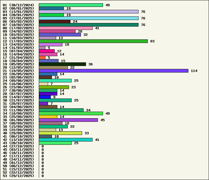 Logiciel | Semaine 43 | Mois 10 | Année 2025 | Total | Anti Yeux rouges | 1 | 4 | 50 | 134319 | AutoMail | 1 | 3 | 60 | 1796 | Autorun | 0 | 3 | 35 | 2738 | AxelCodBar (Codes barres) | 5 | 24 | 221 | 17536 | AxelFTP | 1 | 3 | 39 | 1812 | AxelTime | 1 | 4 | 65 | 6772 | AxelWebCam | 0 | 0 | 3 | 8248 | Boulier | 1 | 3 | 41 | 1588 | Castet | 1 | 2 | 33 | 1098 | Chiffres | 1 | 2 | 37 | 1864 | Compteur Internet | 1 | 3 | 58 | 2314 | Crédits | 1 | 1 | 34 | 1999 | Espérance de vie | 1 | 2 | 52 | 3547 | File Renamor | 1 | 2 | 36 | 1964 | FindReplaceInFiles | 1 | 3 | 35 | 1136 | Matricielle | 1 | 5 | 42 | 4561 | Mosaic Maker | 0 | 1 | 32 | 3046 | MultiClip | 1 | 3 | 35 | 2110 | MultiMail | 1 | 2 | 36 | 1074 | MultiZip | 1 | 2 | 36 | 1562 | MusicStart | 1 | 4 | 35 | 911 | RepPrinter | 1 | 2 | 55 | 4101 | Synchronizor | 1 | 3 | 45 | 3923 | Winetik | 0 | 0 | 0 | 1008 | Winfish | 0 | 0 | 0 | 673 | Wintab | 0 | 2 | 23 | 3786 | WorPad Axel | 1 | 2 | 37 | 146 | Yaskifo! analysor | 0 | 0 | 0 | 90 | Total | 25 | 85 | 1175 | 215722 |