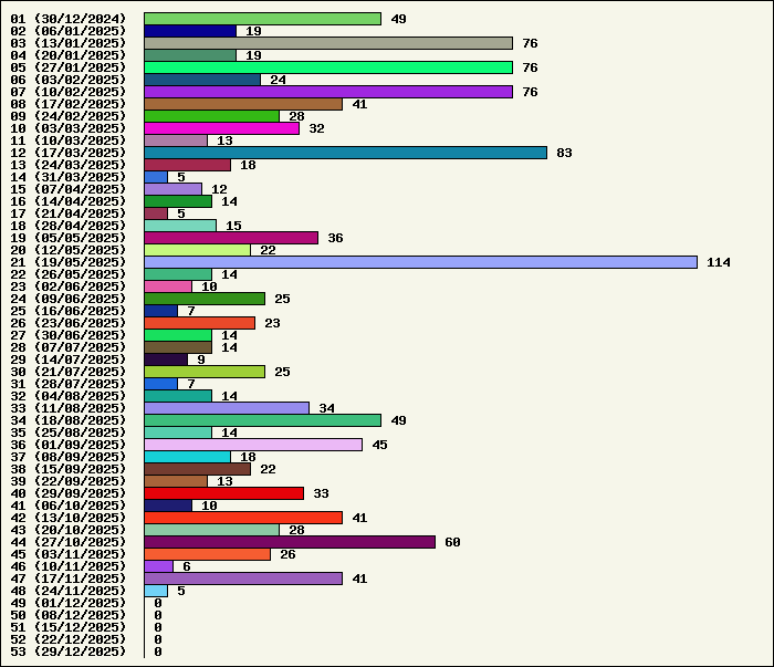 | Logiciel | Semaine 48 | Mois 11 | Année 2025 | Total | | Anti Yeux rouges | 0 | 4 | 54 | 134323 | | AutoMail | 0 | 17 | 79 | 1815 | | Autorun | 0 | 2 | 37 | 2740 | | AxelCodBar (Codes barres) | 0 | 9 | 234 | 17549 | | AxelFTP | 0 | 4 | 43 | 1816 | | AxelTime | 0 | 13 | 79 | 6786 | | AxelWebCam | 0 | 0 | 3 | 8248 | | Boulier | 0 | 1 | 42 | 1589 | | Castet | 0 | 2 | 35 | 1100 | | Chiffres | 0 | 4 | 41 | 1868 | | Compteur Internet | 0 | 5 | 63 | 2319 | | Crédits | 0 | 4 | 38 | 2003 | | Espérance de vie | 0 | 5 | 57 | 3552 | | File Renamor | 0 | 7 | 43 | 1971 | | FindReplaceInFiles | 0 | 1 | 36 | 1137 | | Matricielle | 0 | 3 | 45 | 4564 | | Mosaic Maker | 0 | 3 | 35 | 3049 | | MultiClip | 0 | 1 | 36 | 2111 | | MultiMail | 0 | 4 | 40 | 1078 | | MultiZip | 0 | 2 | 38 | 1564 | | MusicStart | 0 | 9 | 44 | 920 | | RepPrinter | 1 | 6 | 61 | 4107 | | Synchronizor | 0 | 6 | 51 | 3929 | | Winetik | 0 | 0 | 0 | 1008 | | Winfish | 0 | 0 | 0 | 673 | | Wintab | 0 | 0 | 24 | 3787 | | WorPad Axel | 0 | 2 | 39 | 148 | | Yaskifo! analysor | 0 | 0 | 0 | 90 | | Total | 1 | 114 | 1297 | 215844 |