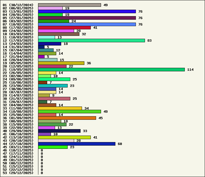| Logiciel | Semaine 45 | Mois 11 | Année 2025 | Total | | Anti Yeux rouges | 0 | 2 | 52 | 134321 | | AutoMail | 6 | 14 | 76 | 1812 | | Autorun | 0 | 1 | 36 | 2739 | | AxelCodBar (Codes barres) | 2 | 3 | 228 | 17543 | | AxelFTP | 1 | 2 | 41 | 1814 | | AxelTime | 2 | 4 | 70 | 6777 | | AxelWebCam | 0 | 0 | 3 | 8248 | | Boulier | 0 | 0 | 41 | 1588 | | Castet | 0 | 1 | 34 | 1099 | | Chiffres | 0 | 3 | 40 | 1867 | | Compteur Internet | 1 | 3 | 61 | 2317 | | Crédits | 0 | 2 | 36 | 2001 | | Espérance de vie | 1 | 3 | 55 | 3550 | | File Renamor | 0 | 6 | 42 | 1970 | | FindReplaceInFiles | 0 | 0 | 35 | 1136 | | Matricielle | 0 | 2 | 44 | 4563 | | Mosaic Maker | 0 | 2 | 34 | 3048 | | MultiClip | 0 | 0 | 35 | 2110 | | MultiMail | 0 | 3 | 39 | 1077 | | MultiZip | 0 | 1 | 37 | 1563 | | MusicStart | 0 | 8 | 43 | 919 | | RepPrinter | 3 | 3 | 58 | 4104 | | Synchronizor | 0 | 2 | 47 | 3925 | | Winetik | 0 | 0 | 0 | 1008 | | Winfish | 0 | 0 | 0 | 673 | | Wintab | 0 | 0 | 24 | 3787 | | WorPad Axel | 0 | 1 | 38 | 147 | | Yaskifo! analysor | 0 | 0 | 0 | 90 | | Total | 16 | 66 | 1249 | 215796 |