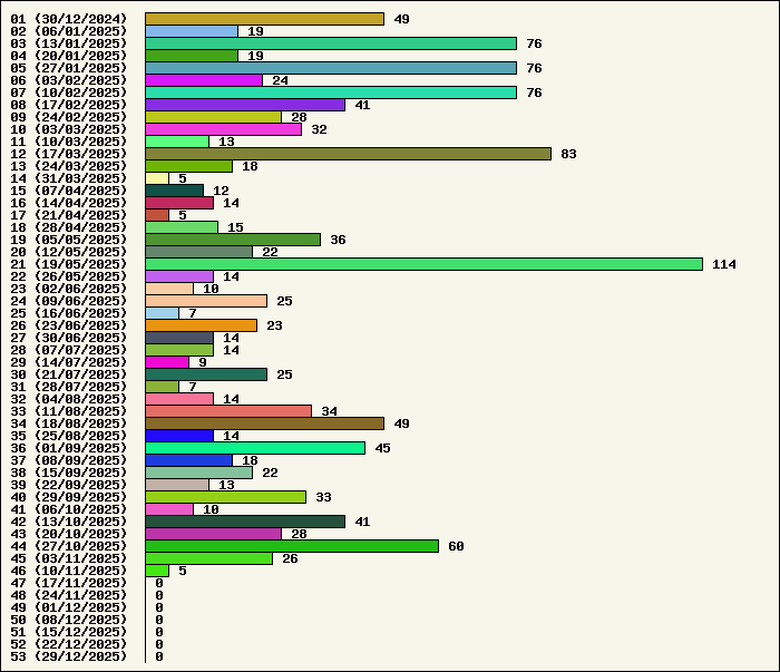 | Logiciel | Semaine 46 | Mois 11 | Année 2025 | Total | | Anti Yeux rouges | 1 | 3 | 53 | 134322 | | AutoMail | 0 | 15 | 77 | 1813 | | Autorun | 0 | 1 | 36 | 2739 | | AxelCodBar (Codes barres) | 2 | 6 | 231 | 17546 | | AxelFTP | 0 | 2 | 41 | 1814 | | AxelTime | 1 | 5 | 71 | 6778 | | AxelWebCam | 0 | 0 | 3 | 8248 | | Boulier | 0 | 0 | 41 | 1588 | | Castet | 0 | 1 | 34 | 1099 | | Chiffres | 0 | 3 | 40 | 1867 | | Compteur Internet | 1 | 4 | 62 | 2318 | | Crédits | 0 | 2 | 36 | 2001 | | Espérance de vie | 0 | 3 | 55 | 3550 | | File Renamor | 0 | 6 | 42 | 1970 | | FindReplaceInFiles | 0 | 0 | 35 | 1136 | | Matricielle | 0 | 2 | 44 | 4563 | | Mosaic Maker | 0 | 2 | 34 | 3048 | | MultiClip | 0 | 0 | 35 | 2110 | | MultiMail | 0 | 3 | 39 | 1077 | | MultiZip | 0 | 1 | 37 | 1563 | | MusicStart | 0 | 8 | 43 | 919 | | RepPrinter | 0 | 3 | 58 | 4104 | | Synchronizor | 0 | 2 | 47 | 3925 | | Winetik | 0 | 0 | 0 | 1008 | | Winfish | 0 | 0 | 0 | 673 | | Wintab | 0 | 0 | 24 | 3787 | | WorPad Axel | 0 | 1 | 38 | 147 | | Yaskifo! analysor | 0 | 0 | 0 | 90 | | Total | 5 | 73 | 1256 | 215803 |