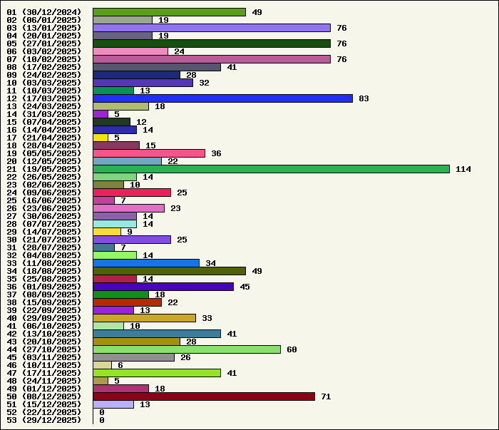 | Logiciel | Semaine 51 | Mois 12 | Année 2025 | Total | | Anti Yeux rouges | 0 | 1 | 55 | 134324 | | AutoMail | 2 | 11 | 90 | 1826 | | Autorun | 0 | 2 | 39 | 2742 | | AxelCodBar (Codes barres) | 1 | 18 | 253 | 17568 | | AxelFTP | 0 | 1 | 44 | 1817 | | AxelTime | 7 | 15 | 94 | 6801 | | AxelWebCam | 0 | 0 | 3 | 8248 | | Boulier | 0 | 2 | 44 | 1591 | | Castet | 0 | 1 | 36 | 1101 | | Chiffres | 0 | 4 | 45 | 1872 | | Compteur Internet | 0 | 2 | 65 | 2321 | | Crédits | 0 | 0 | 38 | 2003 | | Espérance de vie | 0 | 1 | 60 | 3555 | | File Renamor | 0 | 4 | 47 | 1975 | | FindReplaceInFiles | 0 | 5 | 41 | 1142 | | Matricielle | 0 | 3 | 48 | 4567 | | Mosaic Maker | 0 | 0 | 35 | 3049 | | MultiClip | 0 | 2 | 38 | 2113 | | MultiMail | 0 | 2 | 42 | 1080 | | MultiZip | 0 | 2 | 40 | 1566 | | MusicStart | 0 | 0 | 44 | 920 | | RepPrinter | 0 | 2 | 63 | 4109 | | Synchronizor | 0 | 9 | 60 | 3938 | | Winetik | 0 | 0 | 0 | 1008 | | Winfish | 0 | 0 | 0 | 673 | | Wintab | 0 | 3 | 27 | 3790 | | WorPad Axel | 0 | 3 | 42 | 151 | | Yaskifo! analysor | 0 | 0 | 0 | 90 | | Total | 10 | 93 | 1393 | 215940 |