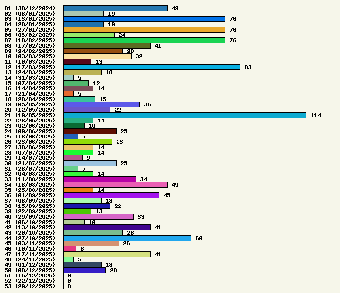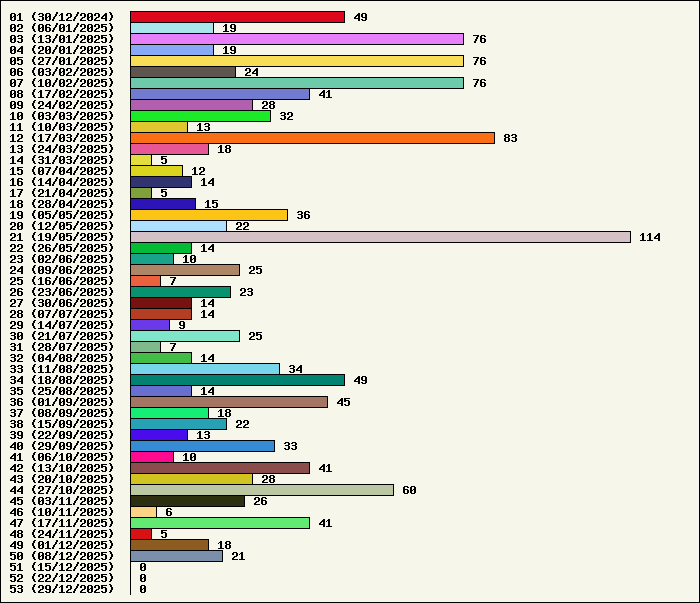 | Logiciel | Semaine 50 | Mois 12 | Année 2025 | Total | | Anti Yeux rouges | 0 | 0 | 54 | 134323 | | AutoMail | 2 | 5 | 84 | 1820 | | Autorun | 0 | 0 | 37 | 2740 | | AxelCodBar (Codes barres) | 6 | 12 | 247 | 17562 | | AxelFTP | 0 | 0 | 43 | 1816 | | AxelTime | 2 | 5 | 84 | 6791 | | AxelWebCam | 0 | 0 | 3 | 8248 | | Boulier | 0 | 0 | 42 | 1589 | | Castet | 0 | 0 | 35 | 1100 | | Chiffres | 0 | 0 | 41 | 1868 | | Compteur Internet | 0 | 1 | 64 | 2320 | | Crédits | 0 | 0 | 38 | 2003 | | Espérance de vie | 0 | 1 | 60 | 3555 | | File Renamor | 0 | 0 | 43 | 1971 | | FindReplaceInFiles | 0 | 0 | 36 | 1137 | | Matricielle | 0 | 0 | 45 | 4564 | | Mosaic Maker | 0 | 0 | 35 | 3049 | | MultiClip | 0 | 0 | 36 | 2111 | | MultiMail | 0 | 1 | 41 | 1079 | | MultiZip | 0 | 0 | 38 | 1564 | | MusicStart | 0 | 0 | 44 | 920 | | RepPrinter | 0 | 0 | 61 | 4107 | | Synchronizor | 7 | 8 | 59 | 3937 | | Winetik | 0 | 0 | 0 | 1008 | | Winfish | 0 | 0 | 0 | 673 | | Wintab | 1 | 1 | 25 | 3788 | | WorPad Axel | 0 | 0 | 39 | 148 | | Yaskifo! analysor | 0 | 0 | 0 | 90 | | Total | 18 | 34 | 1334 | 215881 |