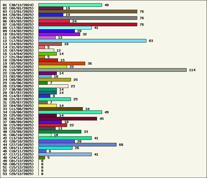 | Logiciel | Semaine 48 | Mois 11 | Année 2025 | Total | | Anti Yeux rouges | 0 | 4 | 54 | 134323 | | AutoMail | 0 | 17 | 79 | 1815 | | Autorun | 0 | 2 | 37 | 2740 | | AxelCodBar (Codes barres) | 1 | 10 | 235 | 17550 | | AxelFTP | 0 | 4 | 43 | 1816 | | AxelTime | 0 | 13 | 79 | 6786 | | AxelWebCam | 0 | 0 | 3 | 8248 | | Boulier | 0 | 1 | 42 | 1589 | | Castet | 0 | 2 | 35 | 1100 | | Chiffres | 0 | 4 | 41 | 1868 | | Compteur Internet | 0 | 5 | 63 | 2319 | | Crédits | 0 | 4 | 38 | 2003 | | Espérance de vie | 2 | 7 | 59 | 3554 | | File Renamor | 0 | 7 | 43 | 1971 | | FindReplaceInFiles | 0 | 1 | 36 | 1137 | | Matricielle | 0 | 3 | 45 | 4564 | | Mosaic Maker | 0 | 3 | 35 | 3049 | | MultiClip | 0 | 1 | 36 | 2111 | | MultiMail | 0 | 4 | 40 | 1078 | | MultiZip | 0 | 2 | 38 | 1564 | | MusicStart | 0 | 9 | 44 | 920 | | RepPrinter | 1 | 6 | 61 | 4107 | | Synchronizor | 0 | 6 | 51 | 3929 | | Winetik | 0 | 0 | 0 | 1008 | | Winfish | 0 | 0 | 0 | 673 | | Wintab | 0 | 0 | 24 | 3787 | | WorPad Axel | 0 | 2 | 39 | 148 | | Yaskifo! analysor | 0 | 0 | 0 | 90 | | Total | 4 | 117 | 1300 | 215847 |