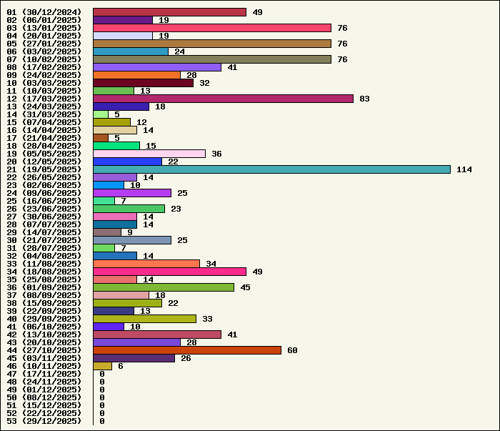 | Logiciel | Semaine 46 | Mois 11 | Année 2025 | Total | | Anti Yeux rouges | 1 | 3 | 53 | 134322 | | AutoMail | 0 | 15 | 77 | 1813 | | Autorun | 0 | 1 | 36 | 2739 | | AxelCodBar (Codes barres) | 2 | 6 | 231 | 17546 | | AxelFTP | 0 | 2 | 41 | 1814 | | AxelTime | 1 | 5 | 71 | 6778 | | AxelWebCam | 0 | 0 | 3 | 8248 | | Boulier | 0 | 0 | 41 | 1588 | | Castet | 0 | 1 | 34 | 1099 | | Chiffres | 0 | 3 | 40 | 1867 | | Compteur Internet | 1 | 4 | 62 | 2318 | | Crédits | 0 | 2 | 36 | 2001 | | Espérance de vie | 0 | 3 | 55 | 3550 | | File Renamor | 0 | 6 | 42 | 1970 | | FindReplaceInFiles | 0 | 0 | 35 | 1136 | | Matricielle | 0 | 2 | 44 | 4563 | | Mosaic Maker | 0 | 2 | 34 | 3048 | | MultiClip | 0 | 0 | 35 | 2110 | | MultiMail | 0 | 3 | 39 | 1077 | | MultiZip | 0 | 1 | 37 | 1563 | | MusicStart | 0 | 8 | 43 | 919 | | RepPrinter | 0 | 3 | 58 | 4104 | | Synchronizor | 0 | 2 | 47 | 3925 | | Winetik | 0 | 0 | 0 | 1008 | | Winfish | 0 | 0 | 0 | 673 | | Wintab | 0 | 0 | 24 | 3787 | | WorPad Axel | 0 | 1 | 38 | 147 | | Yaskifo! analysor | 0 | 0 | 0 | 90 | | Total | 5 | 73 | 1256 | 215803 |