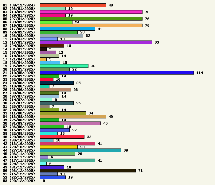 | Logiciel | Semaine 52 | Mois 12 | Année 2025 | Total | | Anti Yeux rouges | 1 | 2 | 56 | 134325 | | AutoMail | 1 | 12 | 91 | 1827 | | Autorun | 0 | 2 | 39 | 2742 | | AxelCodBar (Codes barres) | 3 | 21 | 256 | 17571 | | AxelFTP | 1 | 2 | 45 | 1818 | | AxelTime | 6 | 21 | 100 | 6807 | | AxelWebCam | 0 | 0 | 3 | 8248 | | Boulier | 0 | 2 | 44 | 1591 | | Castet | 0 | 1 | 36 | 1101 | | Chiffres | 1 | 5 | 46 | 1873 | | Compteur Internet | 0 | 2 | 65 | 2321 | | Crédits | 0 | 0 | 38 | 2003 | | Espérance de vie | 0 | 1 | 60 | 3555 | | File Renamor | 1 | 5 | 48 | 1976 | | FindReplaceInFiles | 0 | 5 | 41 | 1142 | | Matricielle | 0 | 3 | 48 | 4567 | | Mosaic Maker | 1 | 1 | 36 | 3050 | | MultiClip | 0 | 2 | 38 | 2113 | | MultiMail | 0 | 2 | 42 | 1080 | | MultiZip | 1 | 3 | 41 | 1567 | | MusicStart | 0 | 0 | 44 | 920 | | RepPrinter | 0 | 2 | 63 | 4109 | | Synchronizor | 0 | 9 | 60 | 3938 | | Winetik | 0 | 0 | 0 | 1008 | | Winfish | 0 | 0 | 0 | 673 | | Wintab | 0 | 3 | 27 | 3790 | | WorPad Axel | 0 | 3 | 42 | 151 | | Yaskifo! analysor | 0 | 0 | 0 | 90 | | Total | 16 | 109 | 1409 | 215956 |