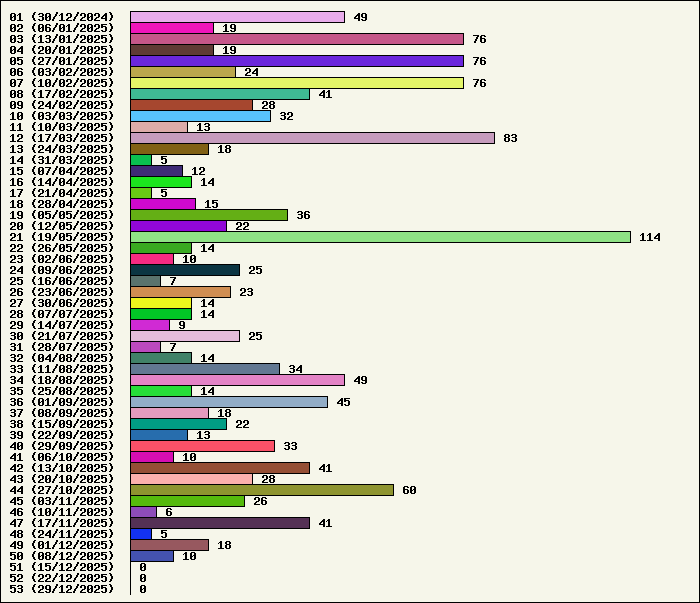 | Logiciel | Semaine 50 | Mois 12 | Année 2025 | Total | | Anti Yeux rouges | 0 | 0 | 54 | 134323 | | AutoMail | 1 | 4 | 83 | 1819 | | Autorun | 0 | 0 | 37 | 2740 | | AxelCodBar (Codes barres) | 1 | 7 | 242 | 17557 | | AxelFTP | 0 | 0 | 43 | 1816 | | AxelTime | 1 | 4 | 83 | 6790 | | AxelWebCam | 0 | 0 | 3 | 8248 | | Boulier | 0 | 0 | 42 | 1589 | | Castet | 0 | 0 | 35 | 1100 | | Chiffres | 0 | 0 | 41 | 1868 | | Compteur Internet | 0 | 1 | 64 | 2320 | | Crédits | 0 | 0 | 38 | 2003 | | Espérance de vie | 0 | 1 | 60 | 3555 | | File Renamor | 0 | 0 | 43 | 1971 | | FindReplaceInFiles | 0 | 0 | 36 | 1137 | | Matricielle | 0 | 0 | 45 | 4564 | | Mosaic Maker | 0 | 0 | 35 | 3049 | | MultiClip | 0 | 0 | 36 | 2111 | | MultiMail | 0 | 1 | 41 | 1079 | | MultiZip | 0 | 0 | 38 | 1564 | | MusicStart | 0 | 0 | 44 | 920 | | RepPrinter | 0 | 0 | 61 | 4107 | | Synchronizor | 7 | 8 | 59 | 3937 | | Winetik | 0 | 0 | 0 | 1008 | | Winfish | 0 | 0 | 0 | 673 | | Wintab | 0 | 0 | 24 | 3787 | | WorPad Axel | 0 | 0 | 39 | 148 | | Yaskifo! analysor | 0 | 0 | 0 | 90 | | Total | 10 | 26 | 1326 | 215873 |