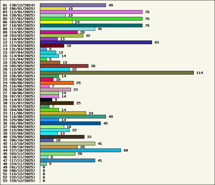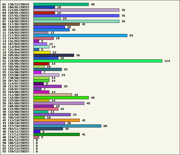 | Logiciel | Semaine 48 | Mois 11 | Année 2025 | Total | | Anti Yeux rouges | 0 | 4 | 54 | 134323 | | AutoMail | 0 | 17 | 79 | 1815 | | Autorun | 0 | 2 | 37 | 2740 | | AxelCodBar (Codes barres) | 1 | 10 | 235 | 17550 | | AxelFTP | 0 | 4 | 43 | 1816 | | AxelTime | 0 | 13 | 79 | 6786 | | AxelWebCam | 0 | 0 | 3 | 8248 | | Boulier | 0 | 1 | 42 | 1589 | | Castet | 0 | 2 | 35 | 1100 | | Chiffres | 0 | 4 | 41 | 1868 | | Compteur Internet | 0 | 5 | 63 | 2319 | | Crédits | 0 | 4 | 38 | 2003 | | Espérance de vie | 2 | 7 | 59 | 3554 | | File Renamor | 0 | 7 | 43 | 1971 | | FindReplaceInFiles | 0 | 1 | 36 | 1137 | | Matricielle | 0 | 3 | 45 | 4564 | | Mosaic Maker | 0 | 3 | 35 | 3049 | | MultiClip | 0 | 1 | 36 | 2111 | | MultiMail | 0 | 4 | 40 | 1078 | | MultiZip | 0 | 2 | 38 | 1564 | | MusicStart | 0 | 9 | 44 | 920 | | RepPrinter | 1 | 6 | 61 | 4107 | | Synchronizor | 0 | 6 | 51 | 3929 | | Winetik | 0 | 0 | 0 | 1008 | | Winfish | 0 | 0 | 0 | 673 | | Wintab | 0 | 0 | 24 | 3787 | | WorPad Axel | 0 | 2 | 39 | 148 | | Yaskifo! analysor | 0 | 0 | 0 | 90 | | Total | 4 | 117 | 1300 | 215847 |