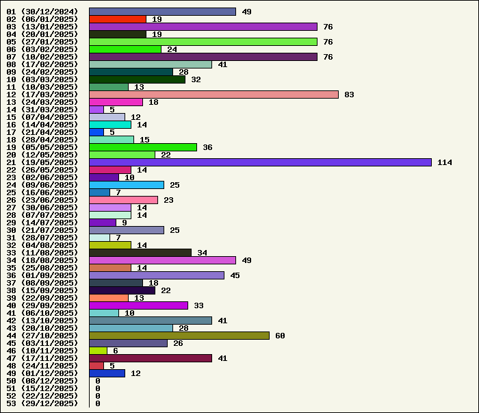 | Logiciel | Semaine 49 | Mois 12 | Année 2025 | Total | | Anti Yeux rouges | 0 | 0 | 54 | 134323 | | AutoMail | 1 | 1 | 80 | 1816 | | Autorun | 0 | 0 | 37 | 2740 | | AxelCodBar (Codes barres) | 5 | 5 | 240 | 17555 | | AxelFTP | 0 | 0 | 43 | 1816 | | AxelTime | 1 | 1 | 80 | 6787 | | AxelWebCam | 0 | 0 | 3 | 8248 | | Boulier | 0 | 0 | 42 | 1589 | | Castet | 0 | 0 | 35 | 1100 | | Chiffres | 0 | 0 | 41 | 1868 | | Compteur Internet | 1 | 1 | 64 | 2320 | | Crédits | 0 | 0 | 38 | 2003 | | Espérance de vie | 1 | 1 | 60 | 3555 | | File Renamor | 0 | 0 | 43 | 1971 | | FindReplaceInFiles | 0 | 0 | 36 | 1137 | | Matricielle | 0 | 0 | 45 | 4564 | | Mosaic Maker | 0 | 0 | 35 | 3049 | | MultiClip | 0 | 0 | 36 | 2111 | | MultiMail | 1 | 1 | 41 | 1079 | | MultiZip | 0 | 0 | 38 | 1564 | | MusicStart | 0 | 0 | 44 | 920 | | RepPrinter | 0 | 0 | 61 | 4107 | | Synchronizor | 1 | 1 | 52 | 3930 | | Winetik | 0 | 0 | 0 | 1008 | | Winfish | 0 | 0 | 0 | 673 | | Wintab | 0 | 0 | 24 | 3787 | | WorPad Axel | 0 | 0 | 39 | 148 | | Yaskifo! analysor | 0 | 0 | 0 | 90 | | Total | 11 | 11 | 1311 | 215858 |