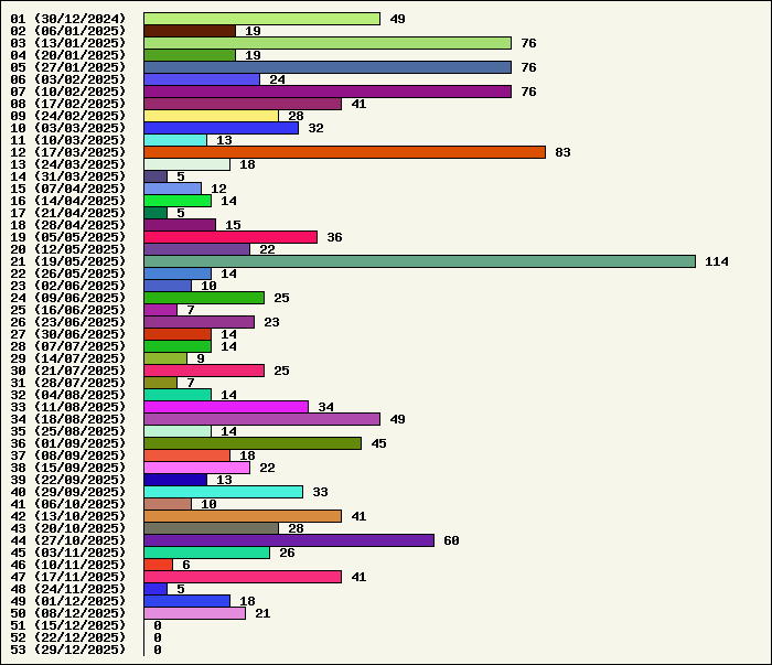 | Logiciel | Semaine 50 | Mois 12 | Année 2025 | Total | | Anti Yeux rouges | 0 | 0 | 54 | 134323 | | AutoMail | 2 | 5 | 84 | 1820 | | Autorun | 0 | 0 | 37 | 2740 | | AxelCodBar (Codes barres) | 7 | 13 | 248 | 17563 | | AxelFTP | 0 | 0 | 43 | 1816 | | AxelTime | 2 | 5 | 84 | 6791 | | AxelWebCam | 0 | 0 | 3 | 8248 | | Boulier | 0 | 0 | 42 | 1589 | | Castet | 0 | 0 | 35 | 1100 | | Chiffres | 0 | 0 | 41 | 1868 | | Compteur Internet | 0 | 1 | 64 | 2320 | | Crédits | 0 | 0 | 38 | 2003 | | Espérance de vie | 0 | 1 | 60 | 3555 | | File Renamor | 0 | 0 | 43 | 1971 | | FindReplaceInFiles | 0 | 0 | 36 | 1137 | | Matricielle | 0 | 0 | 45 | 4564 | | Mosaic Maker | 0 | 0 | 35 | 3049 | | MultiClip | 0 | 0 | 36 | 2111 | | MultiMail | 0 | 1 | 41 | 1079 | | MultiZip | 0 | 0 | 38 | 1564 | | MusicStart | 0 | 0 | 44 | 920 | | RepPrinter | 0 | 0 | 61 | 4107 | | Synchronizor | 7 | 8 | 59 | 3937 | | Winetik | 0 | 0 | 0 | 1008 | | Winfish | 0 | 0 | 0 | 673 | | Wintab | 1 | 1 | 25 | 3788 | | WorPad Axel | 0 | 0 | 39 | 148 | | Yaskifo! analysor | 0 | 0 | 0 | 90 | | Total | 19 | 35 | 1335 | 215882 |