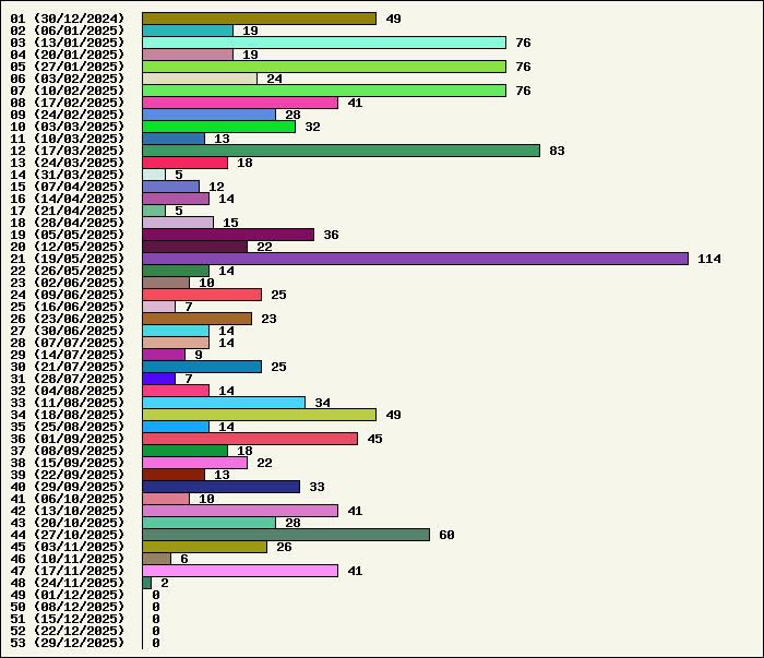 | Logiciel | Semaine 48 | Mois 11 | Année 2025 | Total | | Anti Yeux rouges | 0 | 4 | 54 | 134323 | | AutoMail | 0 | 17 | 79 | 1815 | | Autorun | 0 | 2 | 37 | 2740 | | AxelCodBar (Codes barres) | 0 | 9 | 234 | 17549 | | AxelFTP | 0 | 4 | 43 | 1816 | | AxelTime | 0 | 13 | 79 | 6786 | | AxelWebCam | 0 | 0 | 3 | 8248 | | Boulier | 0 | 1 | 42 | 1589 | | Castet | 0 | 2 | 35 | 1100 | | Chiffres | 0 | 4 | 41 | 1868 | | Compteur Internet | 0 | 5 | 63 | 2319 | | Crédits | 0 | 4 | 38 | 2003 | | Espérance de vie | 0 | 5 | 57 | 3552 | | File Renamor | 0 | 7 | 43 | 1971 | | FindReplaceInFiles | 0 | 1 | 36 | 1137 | | Matricielle | 0 | 3 | 45 | 4564 | | Mosaic Maker | 0 | 3 | 35 | 3049 | | MultiClip | 0 | 1 | 36 | 2111 | | MultiMail | 0 | 4 | 40 | 1078 | | MultiZip | 0 | 2 | 38 | 1564 | | MusicStart | 0 | 9 | 44 | 920 | | RepPrinter | 1 | 6 | 61 | 4107 | | Synchronizor | 0 | 6 | 51 | 3929 | | Winetik | 0 | 0 | 0 | 1008 | | Winfish | 0 | 0 | 0 | 673 | | Wintab | 0 | 0 | 24 | 3787 | | WorPad Axel | 0 | 2 | 39 | 148 | | Yaskifo! analysor | 0 | 0 | 0 | 90 | | Total | 1 | 114 | 1297 | 215844 |