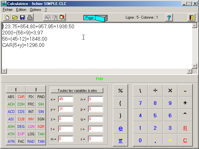 Calculatrice intelligente avec modes ruban et page, analyse syntaxique, multiligne avec possibilité de corrections, enregistrement, impression, mise en évidence des erreurs, utilisation de variables, fonctions mathématiques intégrées, utilisation du clavier ou de la souris, choix de la police d'affichage. Fonctionne aussi sous Ubuntu (linux)