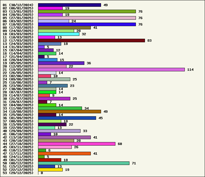 | Logiciel | Semaine 52 | Mois 12 | Année 2025 | Total | | Anti Yeux rouges | 1 | 2 | 56 | 134325 | | AutoMail | 1 | 12 | 91 | 1827 | | Autorun | 0 | 2 | 39 | 2742 | | AxelCodBar (Codes barres) | 3 | 21 | 256 | 17571 | | AxelFTP | 1 | 2 | 45 | 1818 | | AxelTime | 6 | 21 | 100 | 6807 | | AxelWebCam | 0 | 0 | 3 | 8248 | | Boulier | 0 | 2 | 44 | 1591 | | Castet | 0 | 1 | 36 | 1101 | | Chiffres | 1 | 5 | 46 | 1873 | | Compteur Internet | 0 | 2 | 65 | 2321 | | Crédits | 0 | 0 | 38 | 2003 | | Espérance de vie | 0 | 1 | 60 | 3555 | | File Renamor | 1 | 5 | 48 | 1976 | | FindReplaceInFiles | 0 | 5 | 41 | 1142 | | Matricielle | 0 | 3 | 48 | 4567 | | Mosaic Maker | 1 | 1 | 36 | 3050 | | MultiClip | 0 | 2 | 38 | 2113 | | MultiMail | 0 | 2 | 42 | 1080 | | MultiZip | 1 | 3 | 41 | 1567 | | MusicStart | 0 | 0 | 44 | 920 | | RepPrinter | 0 | 2 | 63 | 4109 | | Synchronizor | 0 | 9 | 60 | 3938 | | Winetik | 0 | 0 | 0 | 1008 | | Winfish | 0 | 0 | 0 | 673 | | Wintab | 0 | 3 | 27 | 3790 | | WorPad Axel | 0 | 3 | 42 | 151 | | Yaskifo! analysor | 0 | 0 | 0 | 90 | | Total | 16 | 109 | 1409 | 215956 |