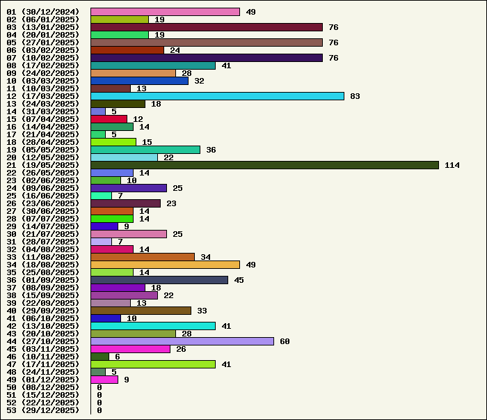 | Logiciel | Semaine 49 | Mois 12 | Année 2025 | Total | | Anti Yeux rouges | 0 | 0 | 54 | 134323 | | AutoMail | 1 | 1 | 80 | 1816 | | Autorun | 0 | 0 | 37 | 2740 | | AxelCodBar (Codes barres) | 3 | 3 | 238 | 17553 | | AxelFTP | 0 | 0 | 43 | 1816 | | AxelTime | 1 | 1 | 80 | 6787 | | AxelWebCam | 0 | 0 | 3 | 8248 | | Boulier | 0 | 0 | 42 | 1589 | | Castet | 0 | 0 | 35 | 1100 | | Chiffres | 0 | 0 | 41 | 1868 | | Compteur Internet | 1 | 1 | 64 | 2320 | | Crédits | 0 | 0 | 38 | 2003 | | Espérance de vie | 0 | 0 | 59 | 3554 | | File Renamor | 0 | 0 | 43 | 1971 | | FindReplaceInFiles | 0 | 0 | 36 | 1137 | | Matricielle | 0 | 0 | 45 | 4564 | | Mosaic Maker | 0 | 0 | 35 | 3049 | | MultiClip | 0 | 0 | 36 | 2111 | | MultiMail | 1 | 1 | 41 | 1079 | | MultiZip | 0 | 0 | 38 | 1564 | | MusicStart | 0 | 0 | 44 | 920 | | RepPrinter | 0 | 0 | 61 | 4107 | | Synchronizor | 1 | 1 | 52 | 3930 | | Winetik | 0 | 0 | 0 | 1008 | | Winfish | 0 | 0 | 0 | 673 | | Wintab | 0 | 0 | 24 | 3787 | | WorPad Axel | 0 | 0 | 39 | 148 | | Yaskifo! analysor | 0 | 0 | 0 | 90 | | Total | 8 | 8 | 1308 | 215855 |