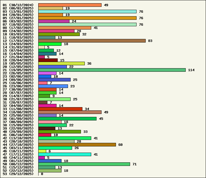 | Logiciel | Semaine 52 | Mois 12 | Année 2025 | Total | | Anti Yeux rouges | 1 | 2 | 56 | 134325 | | AutoMail | 1 | 12 | 91 | 1827 | | Autorun | 0 | 2 | 39 | 2742 | | AxelCodBar (Codes barres) | 3 | 21 | 256 | 17571 | | AxelFTP | 1 | 2 | 45 | 1818 | | AxelTime | 5 | 20 | 99 | 6806 | | AxelWebCam | 0 | 0 | 3 | 8248 | | Boulier | 0 | 2 | 44 | 1591 | | Castet | 0 | 1 | 36 | 1101 | | Chiffres | 1 | 5 | 46 | 1873 | | Compteur Internet | 0 | 2 | 65 | 2321 | | Crédits | 0 | 0 | 38 | 2003 | | Espérance de vie | 0 | 1 | 60 | 3555 | | File Renamor | 1 | 5 | 48 | 1976 | | FindReplaceInFiles | 0 | 5 | 41 | 1142 | | Matricielle | 0 | 3 | 48 | 4567 | | Mosaic Maker | 1 | 1 | 36 | 3050 | | MultiClip | 0 | 2 | 38 | 2113 | | MultiMail | 0 | 2 | 42 | 1080 | | MultiZip | 1 | 3 | 41 | 1567 | | MusicStart | 0 | 0 | 44 | 920 | | RepPrinter | 0 | 2 | 63 | 4109 | | Synchronizor | 0 | 9 | 60 | 3938 | | Winetik | 0 | 0 | 0 | 1008 | | Winfish | 0 | 0 | 0 | 673 | | Wintab | 0 | 3 | 27 | 3790 | | WorPad Axel | 0 | 3 | 42 | 151 | | Yaskifo! analysor | 0 | 0 | 0 | 90 | | Total | 15 | 108 | 1408 | 215955 |