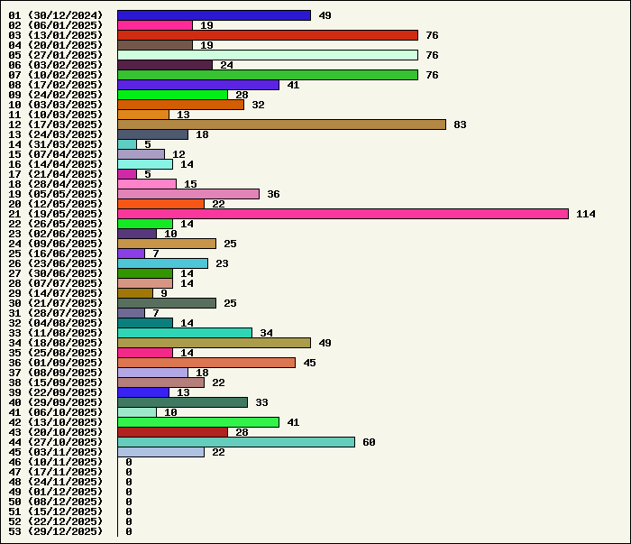 | Logiciel | Semaine 45 | Mois 11 | Année 2025 | Total | | Anti Yeux rouges | 0 | 2 | 52 | 134321 | | AutoMail | 6 | 14 | 76 | 1812 | | Autorun | 0 | 1 | 36 | 2739 | | AxelCodBar (Codes barres) | 2 | 3 | 228 | 17543 | | AxelFTP | 1 | 2 | 41 | 1814 | | AxelTime | 2 | 4 | 70 | 6777 | | AxelWebCam | 0 | 0 | 3 | 8248 | | Boulier | 0 | 0 | 41 | 1588 | | Castet | 0 | 1 | 34 | 1099 | | Chiffres | 0 | 3 | 40 | 1867 | | Compteur Internet | 1 | 3 | 61 | 2317 | | Crédits | 0 | 2 | 36 | 2001 | | Espérance de vie | 1 | 3 | 55 | 3550 | | File Renamor | 0 | 6 | 42 | 1970 | | FindReplaceInFiles | 0 | 0 | 35 | 1136 | | Matricielle | 0 | 2 | 44 | 4563 | | Mosaic Maker | 0 | 2 | 34 | 3048 | | MultiClip | 0 | 0 | 35 | 2110 | | MultiMail | 0 | 3 | 39 | 1077 | | MultiZip | 0 | 1 | 37 | 1563 | | MusicStart | 0 | 8 | 43 | 919 | | RepPrinter | 3 | 3 | 58 | 4104 | | Synchronizor | 0 | 2 | 47 | 3925 | | Winetik | 0 | 0 | 0 | 1008 | | Winfish | 0 | 0 | 0 | 673 | | Wintab | 0 | 0 | 24 | 3787 | | WorPad Axel | 0 | 1 | 38 | 147 | | Yaskifo! analysor | 0 | 0 | 0 | 90 | | Total | 16 | 66 | 1249 | 215796 |