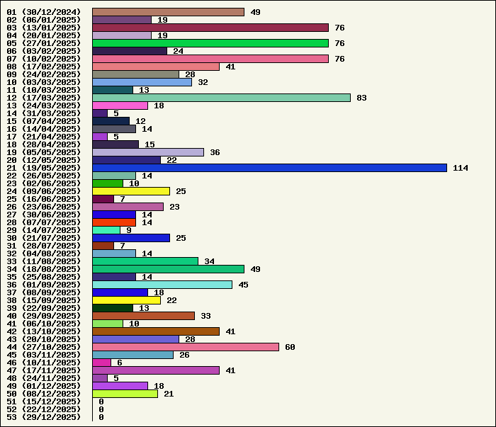 | Logiciel | Semaine 50 | Mois 12 | Année 2025 | Total | | Anti Yeux rouges | 0 | 0 | 54 | 134323 | | AutoMail | 2 | 5 | 84 | 1820 | | Autorun | 0 | 0 | 37 | 2740 | | AxelCodBar (Codes barres) | 7 | 13 | 248 | 17563 | | AxelFTP | 0 | 0 | 43 | 1816 | | AxelTime | 2 | 5 | 84 | 6791 | | AxelWebCam | 0 | 0 | 3 | 8248 | | Boulier | 0 | 0 | 42 | 1589 | | Castet | 0 | 0 | 35 | 1100 | | Chiffres | 0 | 0 | 41 | 1868 | | Compteur Internet | 0 | 1 | 64 | 2320 | | Crédits | 0 | 0 | 38 | 2003 | | Espérance de vie | 0 | 1 | 60 | 3555 | | File Renamor | 0 | 0 | 43 | 1971 | | FindReplaceInFiles | 0 | 0 | 36 | 1137 | | Matricielle | 0 | 0 | 45 | 4564 | | Mosaic Maker | 0 | 0 | 35 | 3049 | | MultiClip | 0 | 0 | 36 | 2111 | | MultiMail | 0 | 1 | 41 | 1079 | | MultiZip | 0 | 0 | 38 | 1564 | | MusicStart | 0 | 0 | 44 | 920 | | RepPrinter | 0 | 0 | 61 | 4107 | | Synchronizor | 7 | 8 | 59 | 3937 | | Winetik | 0 | 0 | 0 | 1008 | | Winfish | 0 | 0 | 0 | 673 | | Wintab | 1 | 1 | 25 | 3788 | | WorPad Axel | 0 | 0 | 39 | 148 | | Yaskifo! analysor | 0 | 0 | 0 | 90 | | Total | 19 | 35 | 1335 | 215882 |